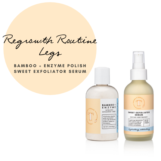 Bamboo polish and Sweet Exfoliator Serum – this two-step process will take your legs from dry and itchy to hydrated and ready for one amazing Sugaring experience. Get out all those trapped hairs, rehydrate and slough off rough patched on the knees and feet